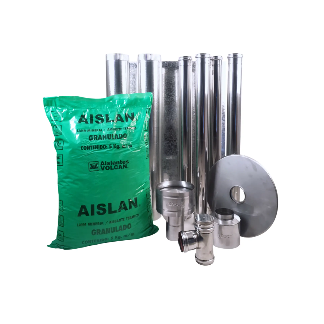 Este kit está diseñado para realizar la instalación interior de estufas a pellet en viviendas de un piso, donde los cañones atraviesan verticalmente el interior de la casa.